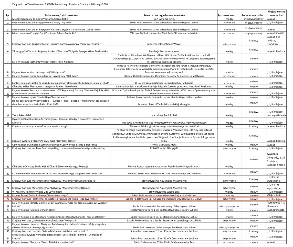 Zarządzeniem nr 25/2024 Lubelskiego Kuratora Oświaty z dnia 28 lutego 2024 r. nasz konkurs znalazł się w wykazie konkursów, które mogą być wymienione na świadectwie ukończenia szkoły podstawowej oraz uwzględniane w postępowaniu rekrutacyjnym na rok szkolny 2024/2025 w województwie lubelskim pod warunkiem zajęcia miejsc I-III.