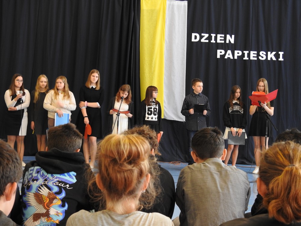„Blask Prawdy (Veritatis Splendor)” – pod takim hasłem już po raz XXII obchodzony był w 2022 roku Dzień Papieski. Dzień obchodzony był w niedzielę 16 października, czyli w rocznicę wyboru Karola Wojtyły na Papieża. Ze względu na absencje nauczycieli przygotowujących uroczystość, w naszej szkole tegoroczne obchody miały miejsce w dniu 2 listopada. Pod kierunkiem Pani Grażyny Bojarskiej i Pana Krzysztofa Darmochwała uczniowie przypomnieli zebranym sylwetkę naszego wielkiego rodaka, anegdoty z jego życia, przeplatając deklamację tekstów utworami muzycznymi, które należały do ulubionych utworów Jana Pawła II.