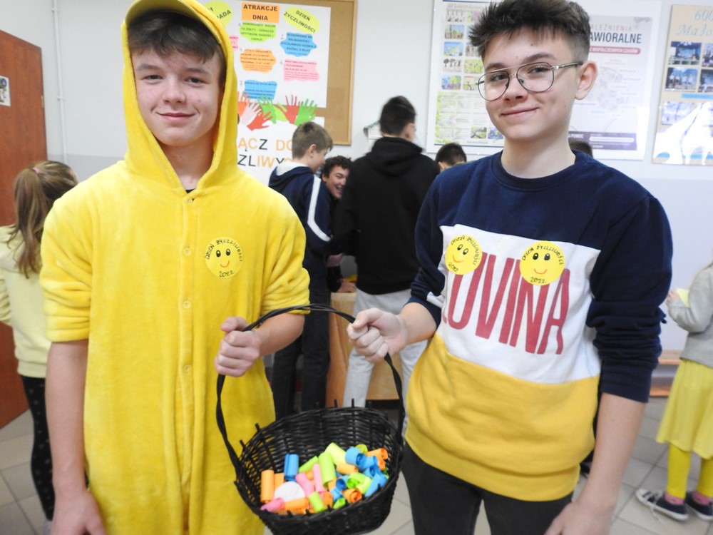 W tym roku po raz kolejny włączyliśmy się w obchody Światowego Dnia Życzliwości i Pozdrowień. W ramach tej akcji w poniedziałek 21 listopada zrealizowanych zostało wiele działań. Samorząd Uczniowski poprzez akcje chciał podkreślić jak ważne dla każdego z nas jest być serdecznym, miłym, uśmiechniętym i pomocnym. Dominującym kolorem w tym dniu był kolor życzliwości, czyli żółty. Dzień rozpoczął się od konkursu na najbardziej życzliwego ucznia z każdej z klas. Na przerwach uczniowie otrzymali „Ordery Życzliwości” oraz cytaty związane z hasłem: życzliwość. Przez cały dzień na korytarzach szkolnych stały skrzynki, do których wszyscy mogli wrzucić kartki z życzeniami, podziękowaniami i pozdrowieniami adresowane do innych osób. „Życzliwe listy” rozdane zostały adresatom na godzinach wychowawczych. Korytarze tego dnia ozdobione były plakatami z hasłem: „Dołącz do życzliwych” wykonanymi przez Samorząd Uczniowski. Uczniowie, którzy uzyskali największą liczbę głosów w konkursie otrzymali pamiątkowe dyplomy i upominki.
