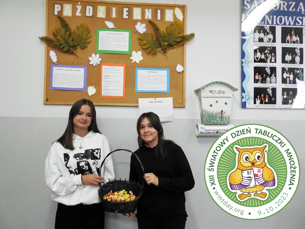 W poniedziałek 9 października w naszej szkole obchodziliśmy XIII Światowy Dzień Tabliczki Mnożenia i Uśmiechu. Nauczyciele matematyki zorganizowali aktywną przerwę, podczas której przedstawiciele SU odpytywali ze znajomości tabliczki mnożenia zarówno uczniów jak i nauczycieli. Każda poprawna odpowiedź nagrodzona była cukierkiem i zadowoleniem na twarzach zarówno nagrodzonych jak i zadających pytania. Celem akcji było zachęcenie uczniów do przypomnienie sobie tabliczki mnożenia w przyjemny i niecodzienny sposób. W tym dniu został również przeprowadzony test sprawdzający znajomość tabliczki mnożenia wśród uczniów klas 4-8. Akcja stała się okazją do nadrobienia „tabliczkowych” zaległości po wakacjach.
