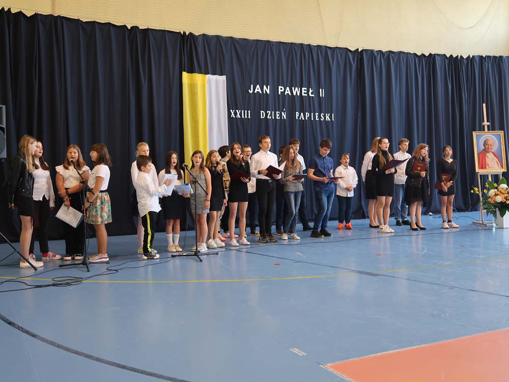 „Św. Jan Paweł II. Cywilizacja życia” – pod takim hasłem w dniu 15 października już po raz XXIII obchodzony będzie Dzień Papieski. W naszej szkole uroczystość z tej okazji zorganizowana została w środę 11 października. Uczniowie przygotowani przez ks. Rafała Lamorskiego przypomnieli sylwetkę naszego wielkiego rodaka, przeplatając deklamację tekstów utworami muzycznymi, które należały do ulubionych utworów Jana Pawła II.