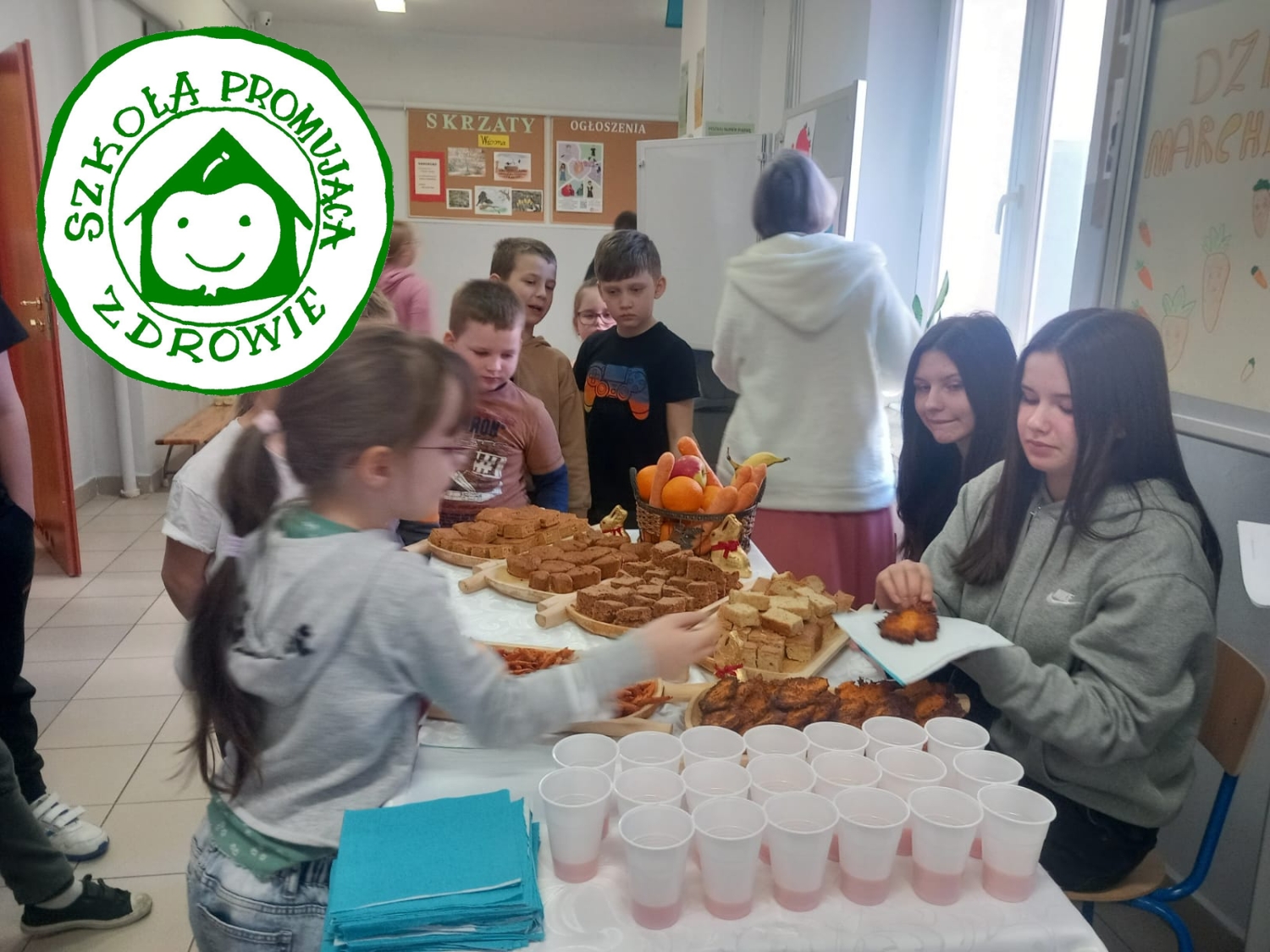 W piątek 4 kwietnia w naszej szkole odbyły się obchody Dnia Marchewki. Zostały one zorganizowane przez klasę 8 w ramach akcji SU „Klasa Gospodarzem Miesiąca”. Dzień Marchewki (International Carrot Day) powstał w 2003 roku, wieść o tym prozdrowotnym święcie dość szybko rozprzestrzeniła się na cały świat. Marchewka to jedno z popularniejszych warzyw, zarówno ze względu na smak, właściwości zdrowotne, jak i możliwość zastosowania jej do najróżniejszych potraw. To warzywo jest pełne witamin i składników odżywczych, zawiera m.in. witaminę A, B6, C, E, K, kwas foliowy, magnez, fosfor, potas, wapń czy żelazo. Regularne spożywanie marchwi wpływa na cerę, wzrok, spowalnia proces starzenia organizmu, zapobiega rozwojowi nowotworów czy chroni przed chorobami serca.
