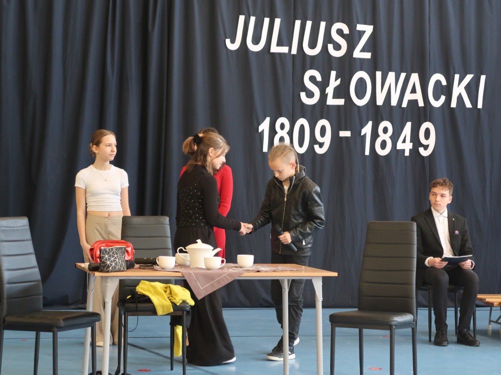 Zgodnie z tradycją na początku kwietnia – w rocznicę śmierci romantycznego poety i wieszcza narodowego Juliusza Słowackiego – cała społeczność szkolna obchodziła Dzień Patrona. Jest to dobra okazja do przypomnienia biografii poety oraz zaprezentowania jego utworów. W tym roku motywem przewodnim była doskonale znana ósmoklasistom „Balladyna” – tragedia w pięciu aktach. Na wstępie odczytane zostały fragmenty listów Słowackiego do matki oraz do Zygmunta Krasińskiego, któremu poeta dedykował ten utwór. Następnie uczniowie przedstawili współczesną wersję „Balladyny”.