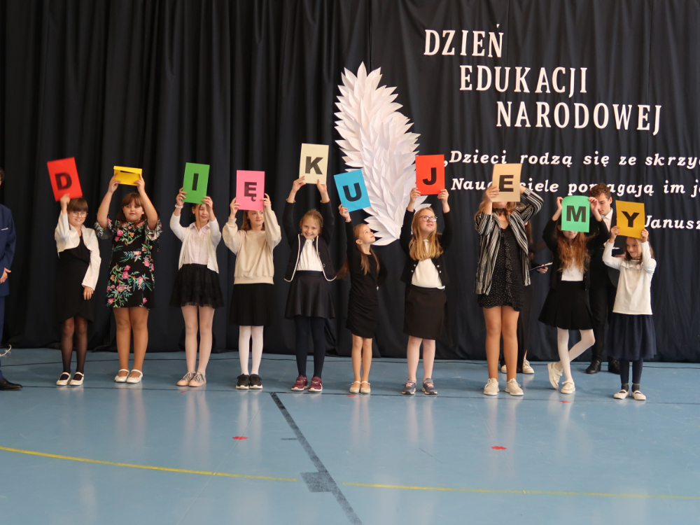 We wtorek 15 października w naszej szkole odbyła się uroczysta akademia z okazji Dnia Edukacji Narodowej. Uroczystość tradycyjnie rozpoczęła się częścią oficjalną, w trakcie której prowadzący nawiązali do historii święta, natomiast dyrektor szkoły złożył wszystkim nauczycielom i pracownikom niepedagogicznym najserdeczniejsze życzenia z okazji ich święta. Po części oficjalnej rozpoczęła się część artystyczna poprowadzona przez uczniów: Roksanę Barańską, Karola Kowalczyka i Karola Antygę. Na wstępie uczniowie klasy 3 zaśpiewali piosenkę „Nauczyciel – Mądra Głowa”. Po głośnych owacjach rozpoczęły się wyjątkowe i nietypowe lekcje w wykonaniu uczniów z klasy 7: Marceliny Rzepki, Karoliny Herbut, Natana Szafrańca i Jakuba Zająca oraz uczennicy klasy 8: Elżbiety Ciepałowicz. Uczniowie, którzy wcielili się tego dnia w rolę nauczycieli przedstawili uczniom cechy idealnego nauczyciela, historię święta Dnia Edukacji Narodowej w Polsce, wiedzę na temat obchodzenia Dnia Edukacji na świecie.