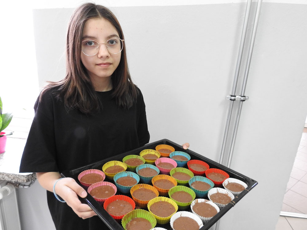Podczas dzisiejszej lekcji języka niemieckiego uczniowie klasy VI i VII wyszli z ławek szkolnych, opuścili salę lekcyjną i przenieśli się do stołówki szkolnej, by utrwalić poznane słownictwo. Powtórka miała nietypowy charakter, ponieważ odbywała się podczas pieczenia babeczek wielkanocnych. Uczniowie utrwalali nazwy artykułów spożywczych, tworzyli proste zdania w języku niemieckim, a przy tym poznawali tradycje wielkanocne panujące w Niemczech. Współpraca i zaangażowanie była na najwyższym poziomie. Zapach wypieków unosił się w całej szkole, przez co można było poczuć magię zbliżających się Świąt Wielkanocnych.