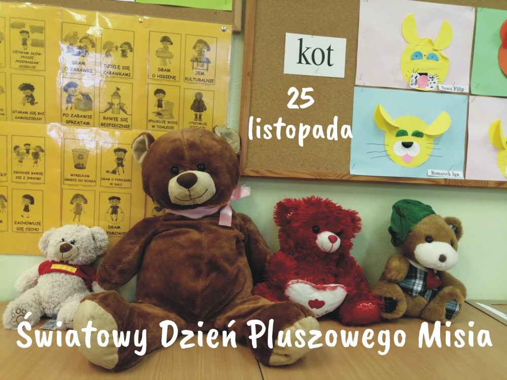 Światowy Dzień Pluszowego Misia obchodzony jest 25 listopada. To nie jest przypadkowa data, bo właśnie tego dnia przypada setna rocznica powstania tej maskotki. Ta zabawka kojarzy się od razu z przyjacielem z dzieciństwa. Zaraz po wejściu do sali oddziału przedszkolnego z różnych miejsc witały dzieci pluszowe misie. W tym dniu prowadzone były różne zajęcia związane z pluszakami. Przedszkolaki poznały także historię narodzin tej zabawki oraz ideę tego święta.