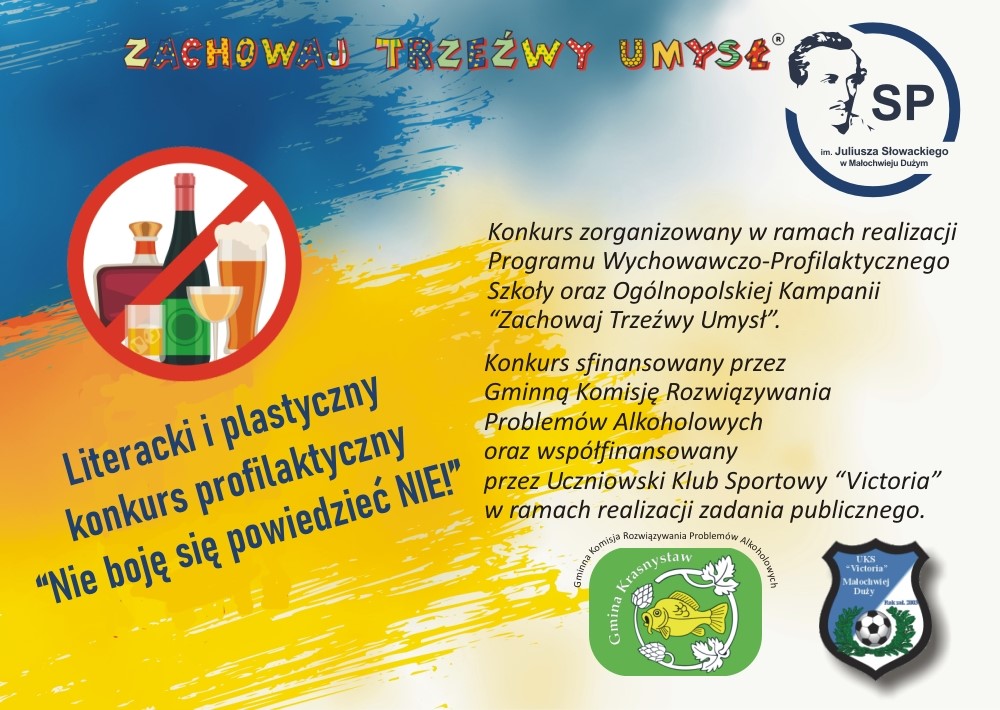 We wtorek 22 listopada rozstrzygnięty został szkolny konkurs profilaktyczny pod hasłem: „Nie boję się powiedzieć NIE!”. Konkurs podzielony został na dwie kategorie: plastyczną i literacką. W kategorii plastycznej zadaniem uczniów klas 1-6 było wykonanie pracy dowolnie wybraną techniką, natomiast w kategorii klas 7-8 zadaniem uczniów było wykonanie plakatu w formacie minimum A3 zawierającego: hasło promujące, treść merytoryczną i szatę graficzną. W kategorii literackiej zadaniem uczniów było ułożenie wiersza/rymowanki lub hasła promującego zdrowy styl życia. Nagrody w konkursie sfinansowane zostały przez Gminną Komisję Rozwiązywania Problemów Alkoholowych w Krasnymstawie.