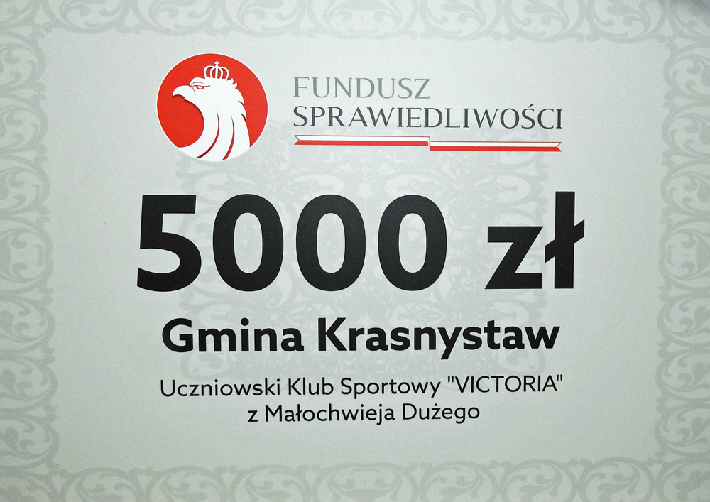 W sobotę 12 listopada w Urzędzie Gminy Krasnystaw odbyło się spotkanie, podczas którego nasz Uczniowski Klub Sportowy „Victoria” otrzymał z rąk wiceministra sprawiedliwości Marcina Romanowskiego czek o wartości 5 tys. zł na zakup sprzętu sportowego. Nasz klub w ramach dofinansowania otrzyma komplety kijków do nordic walking, rower do ćwiczeń na zajęciach z bezpieczeństwa ruchu drogowego oraz nowy stół do tenisa stołowego. W spotkaniu oprócz wiceministra uczestniczyła Pani Edyta Gajowiak-Powroźnik – wójt Gminy Krasnystaw, dyrektor Aresztu Śledczego w Krasnymstawie podpułkownik Piotr Burak oraz przedstawiciele dwóch pozostałych uczniowskich klubów gminnych, które również otrzymały podobne dofinansowanie.