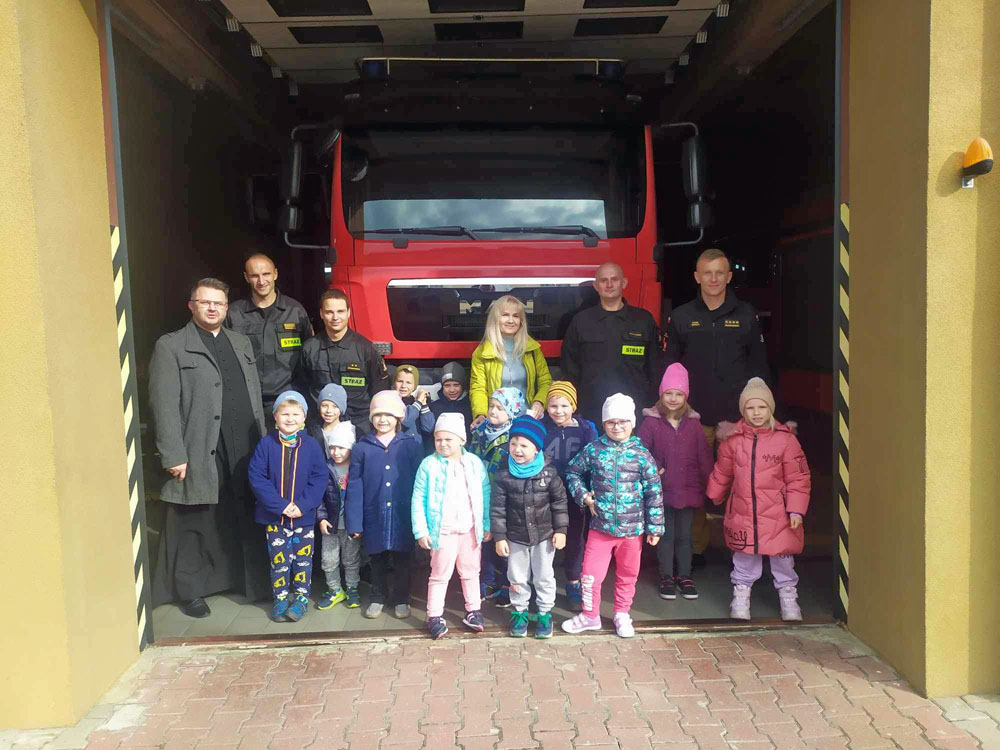 19 października dzieci z grupy przedszkolnej wybrały się na wycieczkę do Komendy Powiatowej Państwowej Straży Pożarnej w Krasnymstawie, aby zapoznać się z tajnikami pracy strażaka. Na miejscu powitali nas Panowie Strażacy i pokazali pomieszczenia wchodzące w skład Sali Edukacyjnej „Ognik”, a więc salę projekcyjną, pokój, w którym odbierane są zgłoszenia o pożarach lub wypadkach oraz garaż. Strażacy opowiedzieli nam o swojej pracy, uświadomili dzieciom jak należy zachować się w sytuacji zagrożenia oraz w jakich okolicznościach należy wzywać straż pożarną. Przy okazji przedszkolaki utrwaliły sobie numer telefonu do Straży Pożarnej – 998 i numer alarmowy – 112. Dzieci miały możliwość podziwiać wyposażenie, jakim dysponują strażacy podczas swojej pracy.