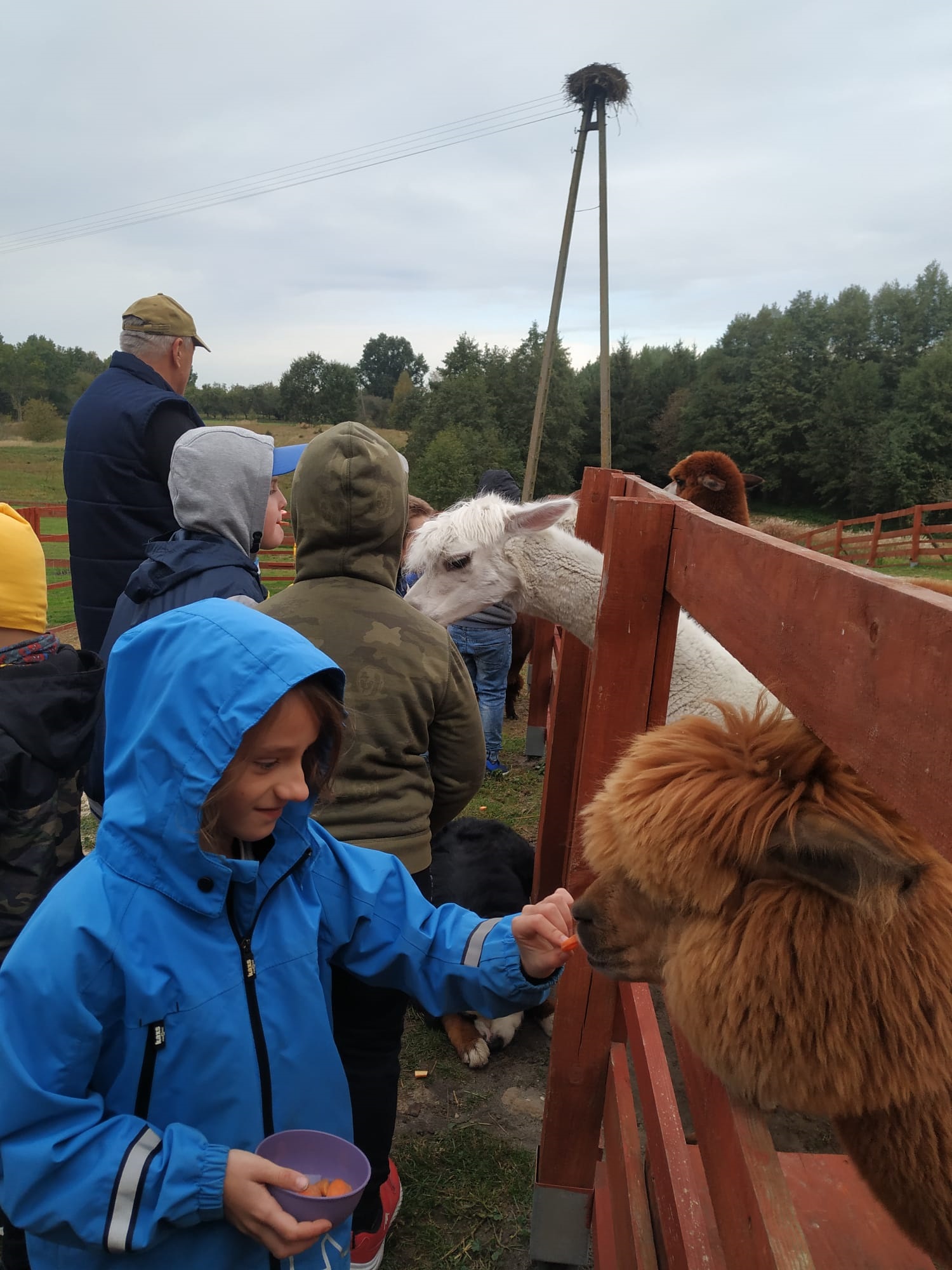 We wtorek 10 października dzieci z oddziału przedszkolnego odwiedziły gospodarstwo agroturystyczne Alpaca's Kingdom w Bzitem. Pogoda nam dopisała. Dzieci były zachwycone zwierzętami, które tam zobaczyły. Przedszkolaki widziały m.in. alpaki, kózki, osiołka, króliki oraz psa. Sympatyczne zwierzęta o miękkim futerku wywoływały uśmiech, pozwalały się zrelaksować i dostarczyły wytchnienia. Większość z nich można było zobaczyć z bliska, dotknąć, pogłaskać. Najlepszą atrakcją było jednak samodzielne karmienie niektórych zwierząt pod ścisłym nadzorem opiekunów. Dużo radości dostarczyły także zabawy na placu zabaw. Na koniec spotkania Gospodarze przygotowali dla wszystkich poczęstunek. Wizyta w tym miejscu na pewno pozostawi niezatarte wspomnienia dla każdego.