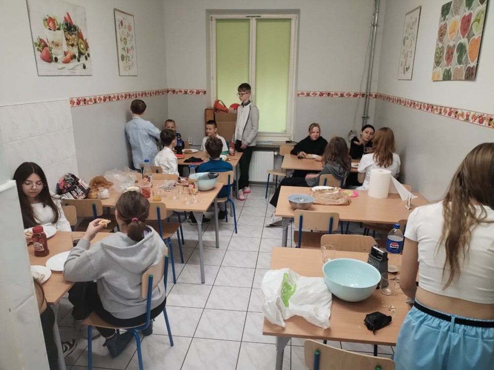 Uczniowie klasy szóstej postanowili Dzień Kobiet spędzić w kuchni. Połączyli świętowanie z integracją i nauką przygotowania prostych potraw. Tym razem zrobili przepyszne zapiekanki. Ponieważ przygotowali ich dużo, zaprosili do degustacji swoich kolegów oraz pracowników szkoły. Wspólne przyrządzanie posiłków a następnie ich spożywanie jest niewątpliwie jedną z najlepszych form budowania dobrych relacji w grupie. Nawet przygotowanie prostych potraw rozwija kreatywność oraz uczy współpracy. Jest to również dobra okazja do rozmowy, do wymiany zdań na różne tematy i do poznawania swoich umiejętności.
