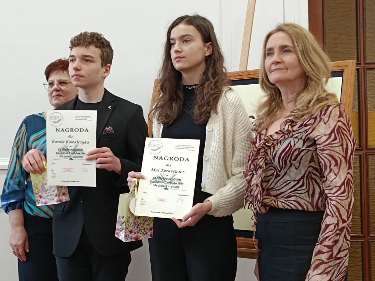 Uczeń klasy VIII - Karol Kowalczyk - otrzymał jedną z trzech głównych nagród w IX Międzyszkolnym Konkursie Czytelniczym „My jednak czytamy”. Organizatorem konkursu – adresowanego do uczniów klas VII-VIII powiatu krasnostawskiego - jest II Liceum Ogólnokształcące im. C. K. Norwida w Krasnymstawie. Zadaniem uczestników było napisanie opinii o książce, która ich szczególnie zainteresowała. Mieli też zachęcić swoich rówieśników do jej przeczytania.