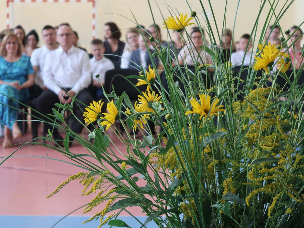W poniedziałek 2 września rozpoczęliśmy rok szkolny 2024/2025. Uczennice klasy ósmej Ela wspólnie z Natalią powitały serdecznie zaproszonych gości, dyrektora szkoły, grono pedagogiczne, pracowników administracji i obsługi, rodziców oraz wszystkich uczniów. Podczas ich wystąpienia nie zabrakło odniesienia do wydarzeń sprzed 85 lat kiedy to 1 września 1939 r. polskie dzieci nie usiadły w szkolnych ławkach a zamiast dzwonka, usłyszały huk armat, świst pocisków i wybuchy bomb. W dalszej części swojego wystąpienia wyraziły nadzieję, że uczniowie nie będą spoczywać na laurach i będą brać aktywny udział w życiu szkoły, a poprzez udział w konkursach, zawodach sportowych i olimpiadach będą rozsławiać imię naszej szkoły na terenie powiatu, województwa a nawet kraju.