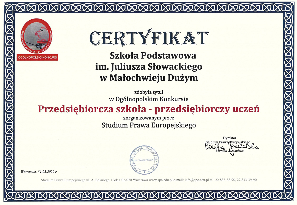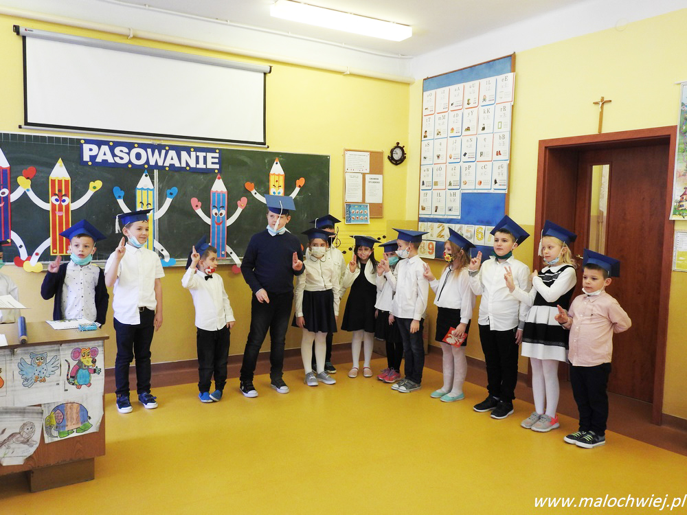 Uczniowie klasy pierwszej już od początku roku szkolnego pod czujnym okiem wychowawczyni przygotowywali się do tradycyjnej uroczystości ślubowania klasy pierwszej połączonej z pasowaniem na ucznia. Termin uroczystości planowany był na ostatnie dni października, ale plany pokrzyżowała pandemia koronawirusa i zawieszenie stacjonarnych zajęć szkolnych. Dzieci jednak dzielnie uczyły się wierszy i piosenek a kiedy wreszcie nadszedł ten na nowo zaplanowany dzień, od samego rana panowała w szkole świąteczna atmosfera. Odświętnie ubrani pierwszoklasiści wspaniale prezentowali swoje umiejętności recytatorskie i muzyczne. Po części artystycznej uczniowie ślubowali być dobrymi Polakami, godnie reprezentować swoją szkołę a swym zachowaniem sprawiać radość rodzicom i nauczycielom. Następnie dyrektor szkoły dokonał symbolicznego pasowania na ucznia. Uczniowie otrzymali pamiątkowe dyplomy oraz upominki przygotowane przez uczniów klasy drugiej. W dalszej części, dyrektor szkoły życzył pierwszakom wielu sukcesów w trakcie ich edukacji w Szkole Podstawowej im. J. Słowackiego w Małochwieju Dużym.