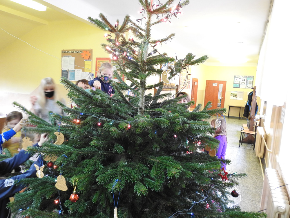 Wszyscy z tęsknotą czekamy na zbliżające się Boże Narodzenie. Czekają mali i duzi. To szczęśliwy czas, który przypomina nam najpiękniejsze chwile: pierwszy śnieg, wizytę św. Mikołaja, strojenie choinki, oczekiwanie na prezenty. Magia Świąt wypełniła już serduszka dzieci z oddziału przedszkolnego. Wiele emocji towarzyszyło ubieraniu choinki, którą wraz ze słodyczami podarował nam Pan Dyrektor. Było mnóstwo radości i zabawy. Na choince nie zabrakło także ozdób wykonanych przez przedszkolaki w ramach zajęć szkolnych.