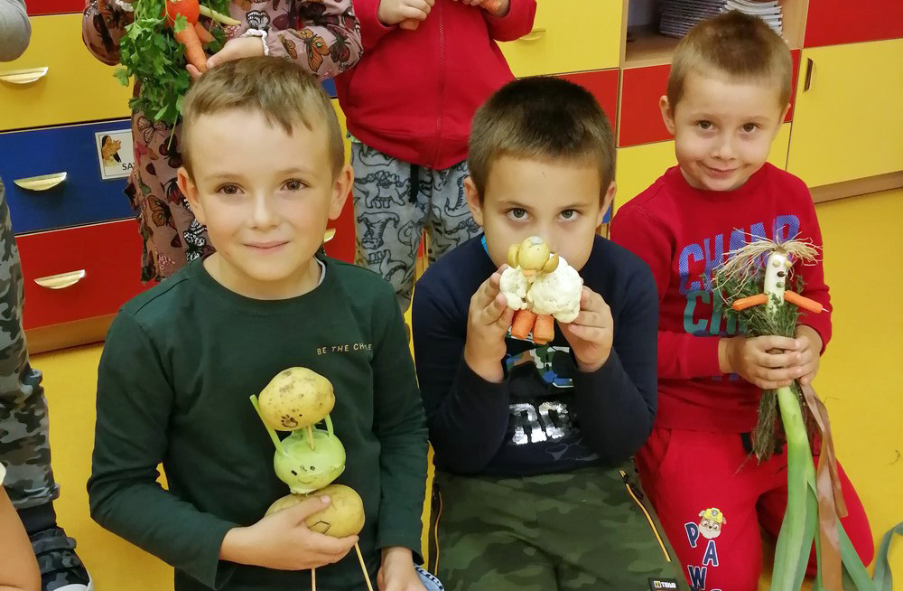 Dlaczego powinniśmy jeść i jak najwięcej warzyw i owoców wiedzą nie tylko dorośli, ale także dzieci z oddziału przedszkolnego. Okazuje się, że można je wykorzystać do świetnej zabawy i wykonać z nich przepiękne kukiełki. Owoce i warzywa zostały przemienione w różne zwierzęta, lalki, misie oraz inne postaci. Podczas ich wykonywania dzieci wykazały się dużym zaangażowaniem, pomysłowością i fantazją. Prace „małych artystów” można było podziwiać na wystawce w sali przedszkolnej.