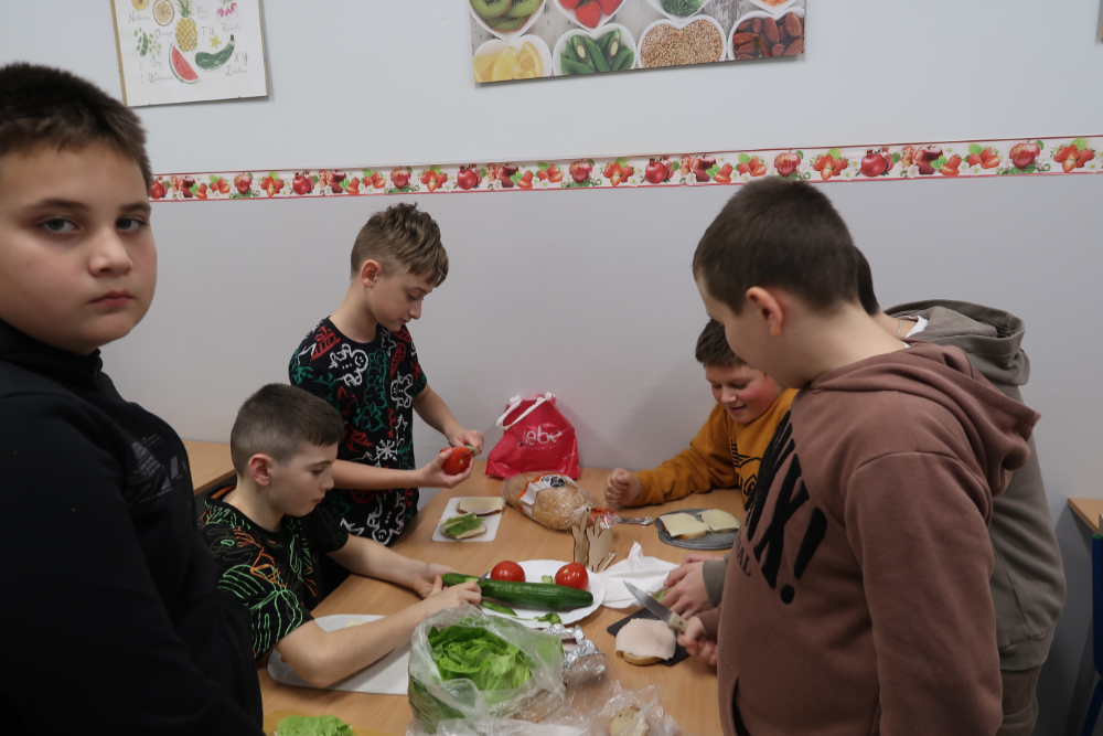Podczas ostatnich zajęć języka niemieckiego uczniowie klasy V wzięli udział w wyjątkowej, bardzo praktycznej lekcji. Tematem zajęć było jedzenie oraz słownictwo związane z przygotowywaniem posiłków, dlatego pani Sylwia zaproponowała, aby uczniowie samodzielnie przygotowali kanapki, używając przy tym wyłącznie języka niemieckiego. Zadanie okazało się nie tylko świetną zabawą, lecz także skutecznym sposobem na utrwalanie nowych słów.