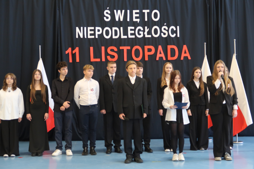 11 listopada to jedna z najważniejszych dat w historii Polski — dzień, w którym w 1918 roku nasza ojczyzna odzyskała upragnioną wolność po 123 latach zaborów. Z tej okazji w naszej szkole odbyła się uroczysta akademia, podczas której cała społeczność szkolna oddała hołd bohaterom walk o niepodległość oraz przypomniała sobie, jak ważne są wartości patriotyczne.Uroczystość rozpoczęła się od wspólnego odśpiewania „Mazurka Dąbrowskiego”.