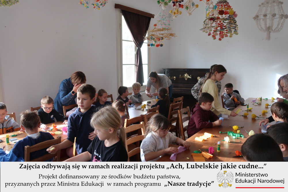 W piątek 14 listopada uczniowie klas 1-3 wzięli udział w kolejnych warsztatach rękodzielniczych w Muzeum Wsi Lubelskiej, które są kolejnymi działaniami, jakie prowadzimy w ramach realizacji naszego projektu pod nazwą „Ach, Lubelskie jakie cudne…”. W pierwszych zajęciach, które odbyły się tydzień wcześniej wzięli udział uczniowie z klas starszych a tematem ich zajęć był pająk ludowy. Tym razem nasi najmłodsi uczniowie pod kierunkiem pani instruktor wykonywali kwiaty z bibuły.