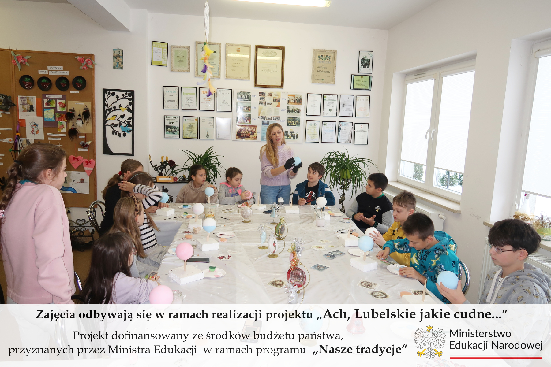 W sobotę 22 listopada zakończyliśmy cykl warsztatowych zajęć rękodzielniczych w ramach realizacji projektu „Ach, Lubelskie jakie cudne…”. W trakcie ostatnich zajęć uczniowie wykonywali bombki z elementami ludowymi i świątecznymi. Bombki wykonywane były techniką dekoracyjną decoupage. Uczniowie, którzy nie mogli uczestniczyć we wszystkich zajęciach warsztatowych, w trakcie sobotnich zajęć mieli szansę nadrobić swoje zaległości wykonując malowidła na szkle. Podsumowaniem zajęć było wspólne integracyjne spotkanie przy pizzy. Zajęcia warsztatowe z rękodzieła przeprowadziła pani Krystyna Malec.