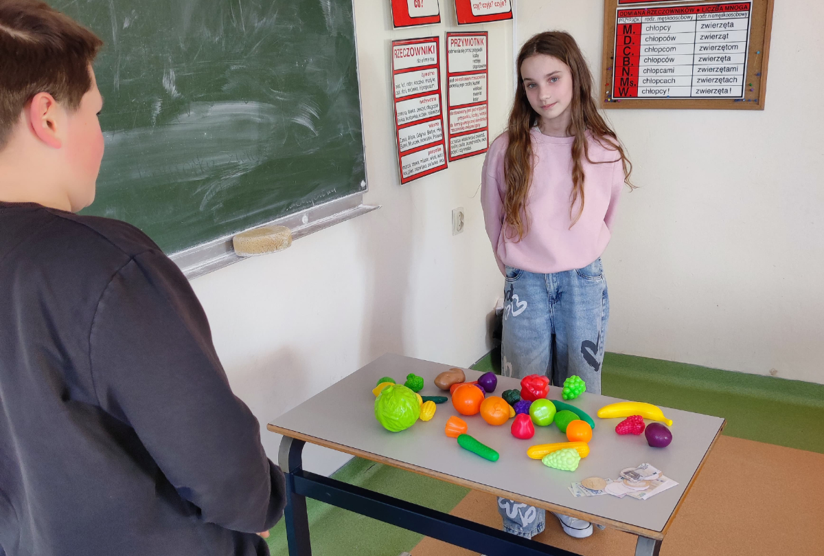 Na zajęciach języka niemieckiego uczniowie aktywnie rozwijają swoje umiejętności komunikacyjne poprzez praktyczne zadania. Jednym z nich jest przygotowywanie krótkich notatek i fiszek z podstawowym słownictwem dotyczącym zakupów. Dzięki temu młodzież utrwala najważniejsze zwroty, takie jak pytanie o cenę, wybór produktu czy wyrażanie prośby. Po stworzeniu materiałów uczniowie przechodzą do części praktycznej, czyli odgrywania dialogów w sklepie. W parach wcielają się w rolę sprzedawcy oraz klienta, starając się jak najnaturalniej prowadzić rozmowę w języku niemieckim.